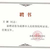 2022年10月18日,我所主任王颖律师、执行主任张敏律师受聘成为成都市人民检察院听证员,聘期五年。